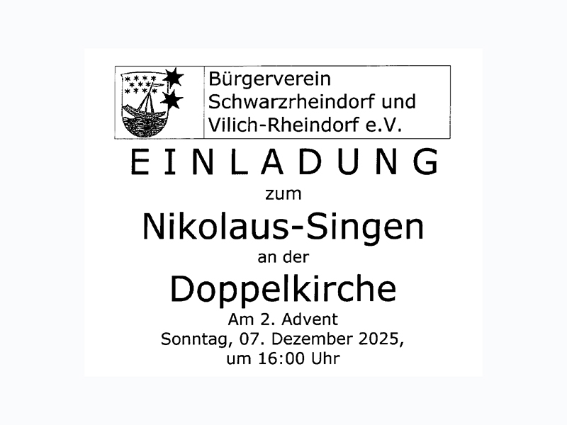 Wir laden Sie herzlich ein zum diesjährigen Nikolaus-Singen: Wann: Sonntag, den 07.12.2025 (2. Advent) Uhrzeit: 16:00 Uhr Wo: An der Doppelkirche Wir freuen uns auf Ihr Kommen. Download als pdf-Datei